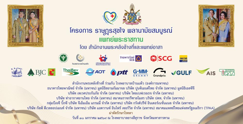 สำนักงานพระคลังข้างที่ ร่วมกับ โรงพยาบาลบ้านแพ้ว (องค์การมหาชน) ธนาคารไทยพาณิชย์ จำกัด (มหาชน) มูลนิธิสยามกัมมาจล บริษัท ปูนซิเมนต์ไทย จำกัด (มหาชน) มูลนิธิเอสซีจี บริษัท เทเวศประกันภัย จำกัด (มหาชน) บริษัท ไทยเบฟเวอเรจ จำกัด (มหาชน) บริษัท ท่าอากาศยานไทย จำกัด (มหาชน) สมาคมราชกรีฑาสโมสร บริษัท ปตท. จำกัด (มหาชน) กลุ่มบีเจซี บิ๊กซี บริษัท จีเอ็มเอ็ม แกรมมี่ จำกัด (มหาชน) บริษัท กรังด์ปรีซ์ อินเตอร์เนชั่นแนล จำกัด (มหาชน) บริษัท กัลฟ์ ดีเวลลอปเมนท์ จำกัด (มหาชน) บริษัท แอดวานซ์ อินโฟร์ เซอร์วิส จำกัด (มหาชน) และสมาคมแพทย์ไทยแห่งสหรัฐอเมริกา (TPAA) จัดโครงการ “ราษฎรสุขใจ พลานามัยสมบูรณ์ แพทย์พระราชทาน” ครั้งที่ 1 ประจำปี 2569 ผ่าตัดรักษาโรคตา ณ โรงพยาบาลยางสีสุราช จังหวัดมหาสารคาม วันที่ 30 มกราคม 2569