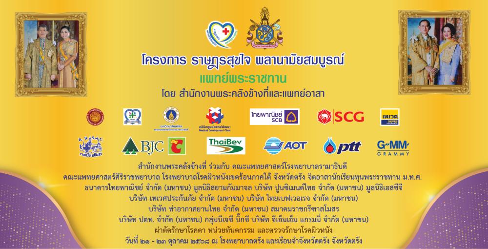 สำนักงานพระคลังข้างที่ ร่วมกับ คณะแพทยศาสตร์โรงพยาบาลรามาธิบดี คณะแพทยศาสตร์ศิริราชพยาบาล โรงพยาบาลโรคผิวหนังเขตร้อนภาคใต้ จังหวัดตรัง จิตอาสานักเรียนทุนพระราชทาน ม.ท.ศ. ธนาคารไทยพาณิชย์ จำกัด (มหาชน) มูลนิธิสยามกัมมาจล บริษัท ปูนซิเมนต์ไทย จำกัด (มหาชน) มูลนิธิเอสซีจี บริษัท เทเวศประกันภัย จำกัด (มหาชน) บริษัท ไทยเบฟเวอเรจ จำกัด (มหาชน) บริษัท ท่าอากาศยานไทย จำกัด (มหาชน) สมาคมราชกรีฑาสโมสร บริษัท ปตท. จำกัด (มหาชน) กลุ่มบีเจซี บิ๊กซี และบริษัท จีเอ็มเอ็ม แกรมมี่ จำกัด (มหาชน) จัดโครงการ “ราษฎรสุขใจ พลานามัยสมบูรณ์ แพทย์พระราชทาน” ครั้งที่ 18 ประจำปี 2568 ผ่าตัดรักษาโรคตา หน่วยทันตกรรม และตรวจรักษาโรคผิวหนัง ณ โรงพยาบาลตรัง และเรือนจำจังหวัดตรัง จังหวัดตรัง วันที่ 21-23 ตุลาคม 2568