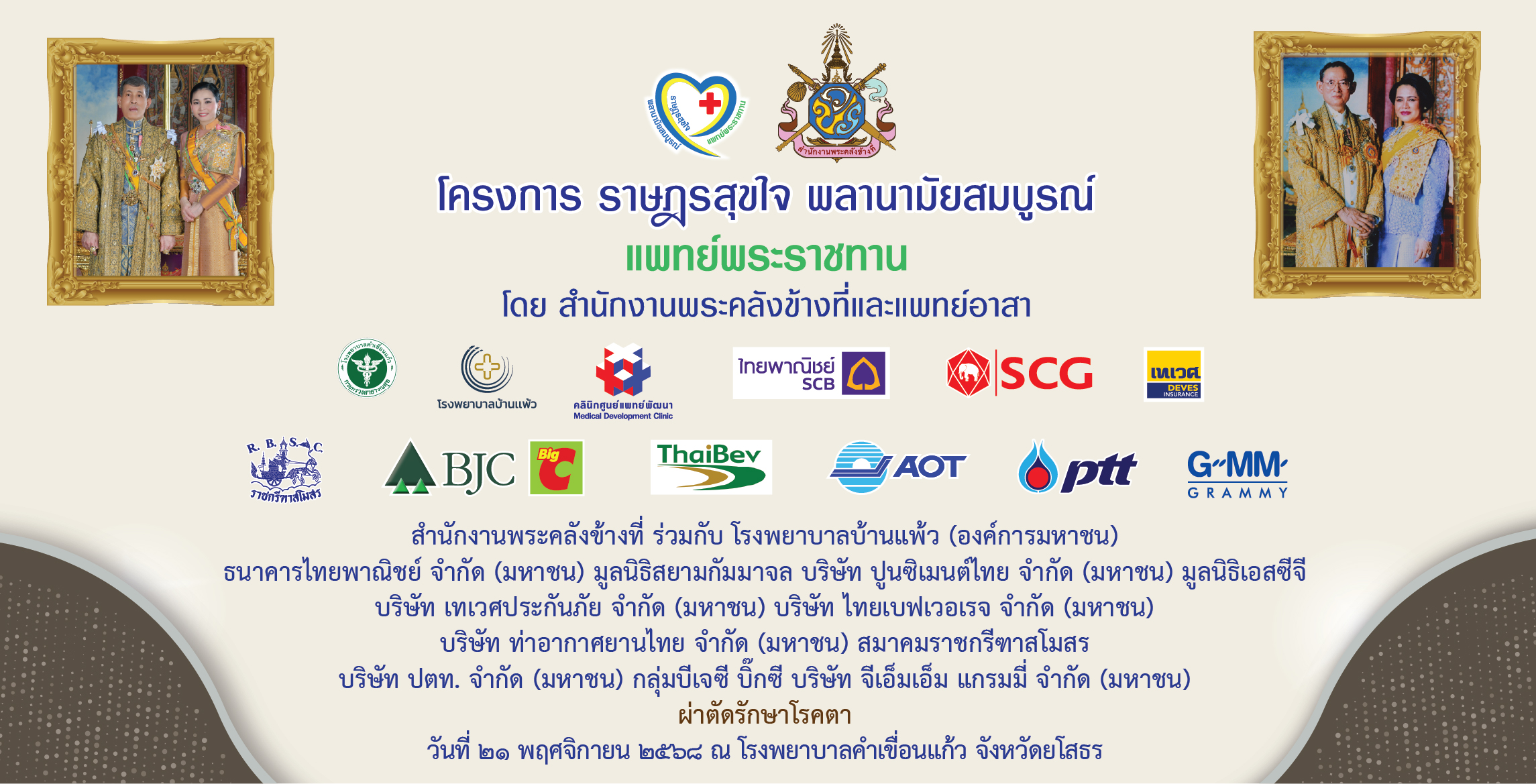 สำนักงานพระคลังข้างที่ ร่วมกับ โรงพยาบาลบ้านแพ้ว (องค์การมหาชน) ธนาคารไทยพาณิชย์ จำกัด (มหาชน) มูลนิธิสยามกัมมาจล บริษัท ปูนซิเมนต์ไทย จำกัด (มหาชน) มูลนิธิเอสซีจี บริษัท เทเวศประกันภัย จำกัด (มหาชน) บริษัท ไทยเบฟเวอเรจ จำกัด (มหาชน) บริษัท ท่าอากาศยานไทย จำกัด (มหาชน) สมาคมราชกรีฑาสโมสร บริษัท ปตท. จำกัด (มหาชน) กลุ่มบีเจซี บิ๊กซี และบริษัท จีเอ็มเอ็ม แกรมมี่ จำกัด (มหาชน) จัดโครงการ “ราษฎรสุขใจ พลานามัยสมบูรณ์ แพทย์พระราชทาน” ครั้งที่ 20 ประจำปี 2568 ผ่าตัดรักษาโรคตา ณ โรงพยาบาลคำเขื่อนแก้ว จังหวัดยโสธร วันที่ 21 พฤศจิกายน 2568