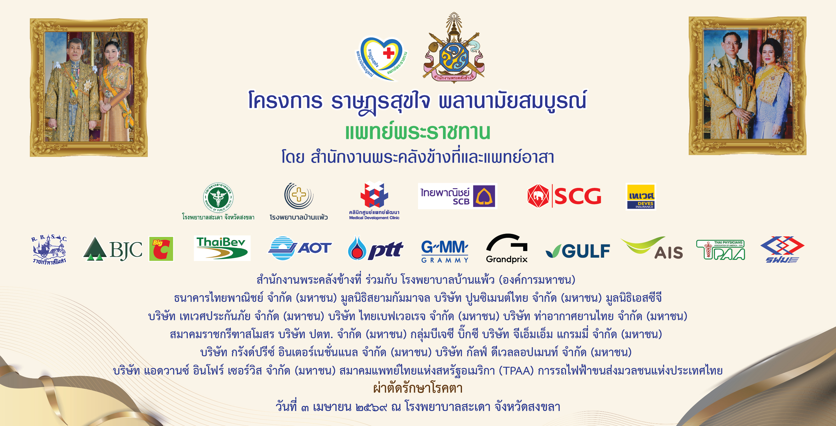 สำนักงานพระคลังข้างที่ ร่วมกับ โรงพยาบาลบ้านแพ้ว (องค์การมหาชน) ธนาคารไทยพาณิชย์ จำกัด (มหาชน) มูลนิธิสยามกัมมาจล บริษัท ปูนซิเมนต์ไทย จำกัด (มหาชน) มูลนิธิเอสซีจี บริษัท เทเวศประกันภัย จำกัด (มหาชน) บริษัท ไทยเบฟเวอเรจ จำกัด (มหาชน) บริษัท ท่าอากาศยานไทย จำกัด (มหาชน) สมาคมราชกรีฑาสโมสร บริษัท ปตท. จำกัด (มหาชน) กลุ่มบีเจซี บิ๊กซี บริษัท จีเอ็มเอ็ม แกรมมี่ จำกัด (มหาชน) บริษัท กรังด์ปรีซ์ อินเตอร์เนชั่นแนล จำกัด (มหาชน) บริษัท กัลฟ์ ดีเวลลอปเมนท์ จำกัด (มหาชน) บริษัท แอดวานซ์ อินโฟร์ เซอร์วิส จำกัด (มหาชน) สมาคมแพทย์ไทยแห่งสหรัฐอเมริกา (TPAA) และการรถไฟฟ้าขนส่งมวลชนแห่งประเทศไทย จัดโครงการ “ราษฎรสุขใจ พลานามัยสมบูรณ์ แพทย์พระราชทาน” ครั้งที่ 5 ประจำปี 2569 ผ่าตัดรักษาโรคตา ณ โรงพยาบาลสะเดา จังหวัดสงขลา วันที่ 3 เมษายน 2569