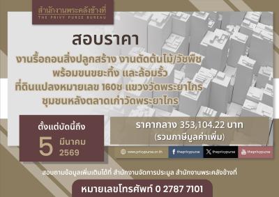 สอบราคางานรื้อถอนสิ่งปลูกสร้าง งานตัดต้นไม้/วัชพืช พร้อมขนขยะทิ้ง และล้อมรั้ว ที่ดินแปลงหมายเลข 160ช แขวงวัดพระยาไกร ชุมชนหลังตลาดเก่าวัดพระยาไกร