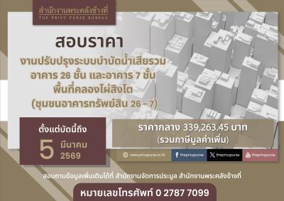 สอบราคางานปรับปรุงระบบบำบัดน้ำเสียรวม อาคาร 26 ชั้น และอาคาร 7 ชั้น พื้นที่คลองไผ่สิงโต (ชุมชนอาคารทรัพย์สิน 26-7)