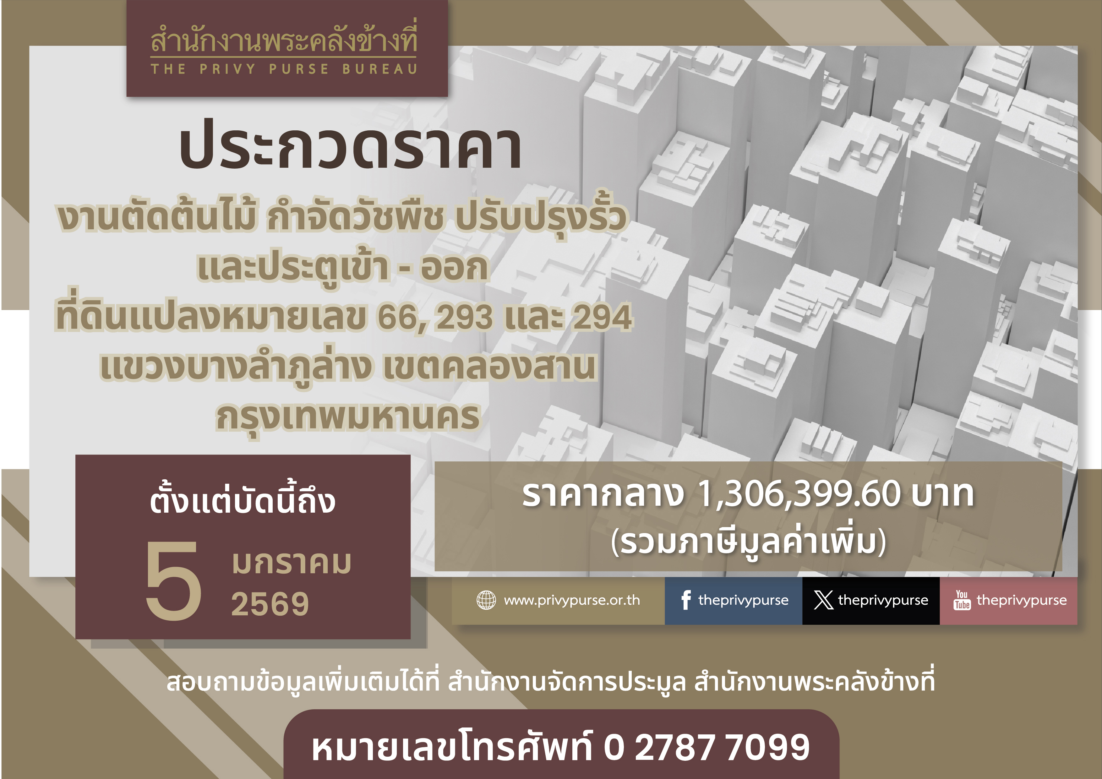 สำนักงานพระคลังข้างที่ เปิดประกวดราคางานตัดต้นไม้ กำจัดวัชพืช ปรับปรุงรั้ว และประตูเข้า - ออก ที่ดินแปลงหมายเลข 66, 293 และ 294 แขวงบางลำภูล่าง เขตคลองสาน กรุงเทพมหานคร