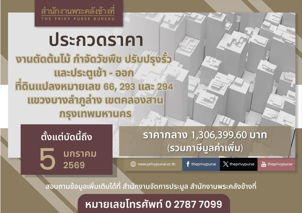 | กำหนดการ | วันที่ 17 ธันวาคม 2568 - 5 มกราคม 2569 วันที่ 7 มกราคม 2569 วันที่ 14 มกราคม 2569 ประกวดราคา ณ ห้องประชุม 6406 อาคารภูมิการุณย์ ชั้น 4 สำนักงานพระคลังข้างที่