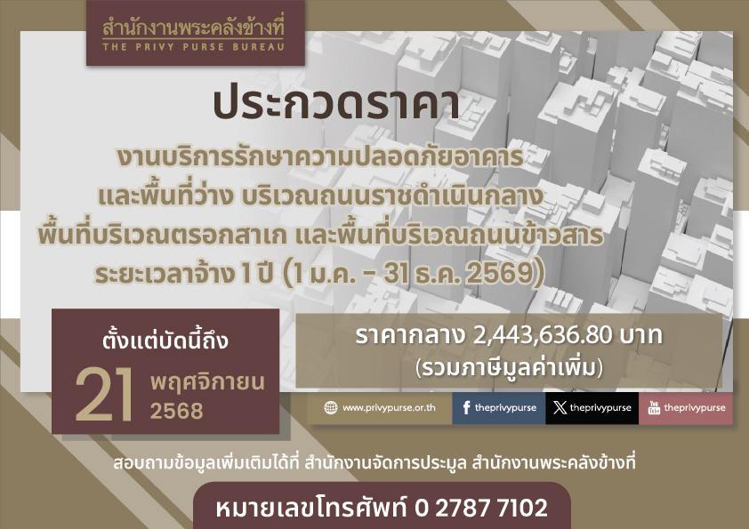 สำนักงานพระคลังข้างที่ เปิดประกวดราคางานบริการรักษาความปลอดภัยอาคารและพื้นที่ว่าง บริเวณถนนราชดำเนินกลาง พื้นที่บริเวณตรอกสาเก และพื้นที่บริเวณถนนข้าวสาร ระยะเวลาจ้าง 1 ปี (1 ม.ค. - 31 ธ.ค. 2569)