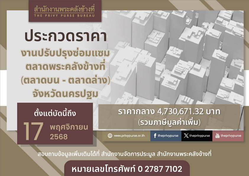 สำนักงานพระคลังข้างที่ เปิดประกวดราคางานปรับปรุงซ่อมแซมตลาดพระคลังข้างที่ (ตลาดบน - ตลาดล่าง) จังหวัดนครปฐม