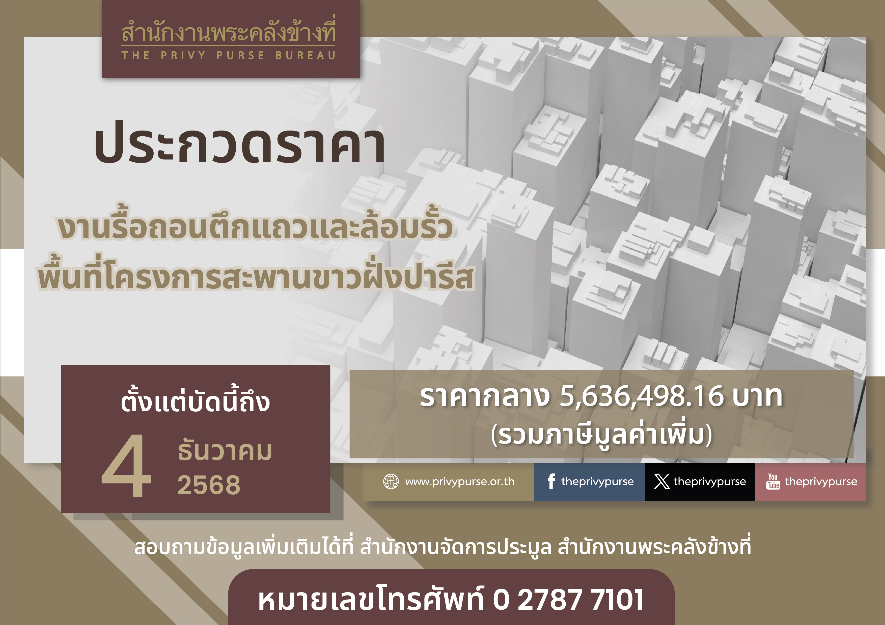 สำนักงานพระคลังข้างที่ เปิดประกวดราคางานรื้อถอนตึกแถวและล้อมรั้วพื้นที่โครงการสะพานขาวฝั่งปารีส