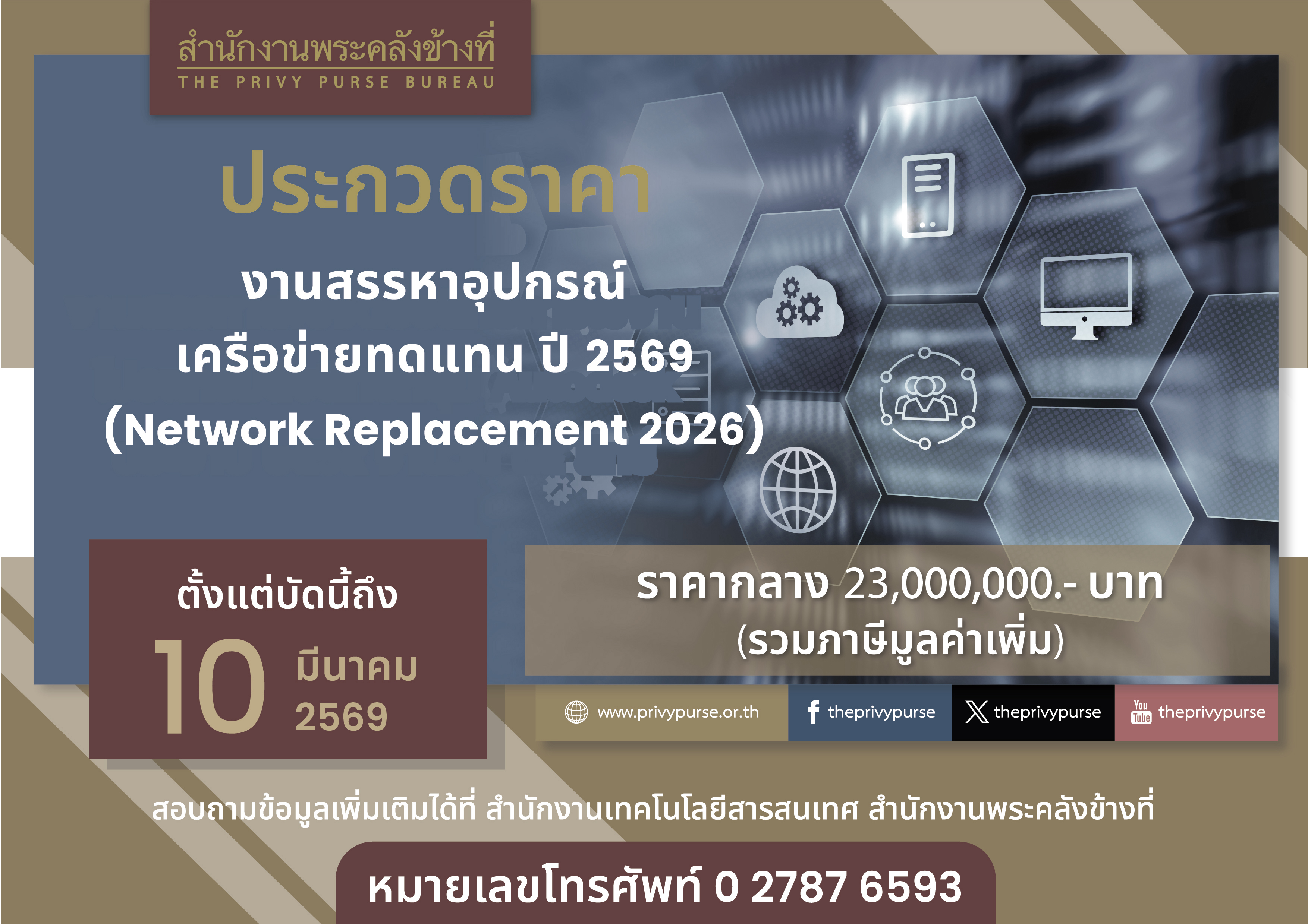 สำนักงานพระคลังข้างที่ เปิดประกวดราคางานสรรหาอุปกรณ์เครือข่ายทดแทน ปี 2569 (Network Replacement 2026)