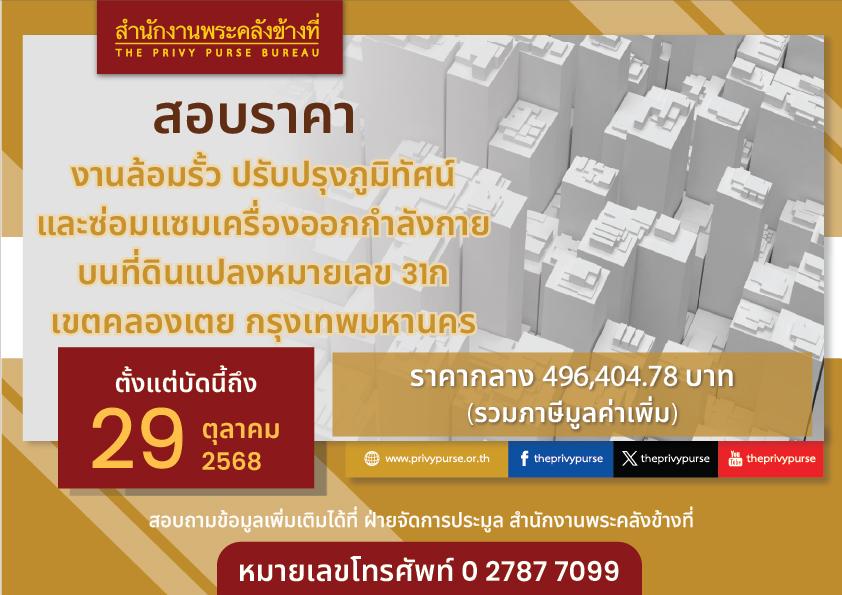 สำนักงานพระคลังข้างที่ เปิดสอบราคางานล้อมรั้ว ปรับปรุงภูมิทัศน์ และซ่อมแซมเครื่องออกกำลังกาย บนที่ดินแปลงหมายเลข 31ก เขตคลองเตย กรุงเทพมหานคร