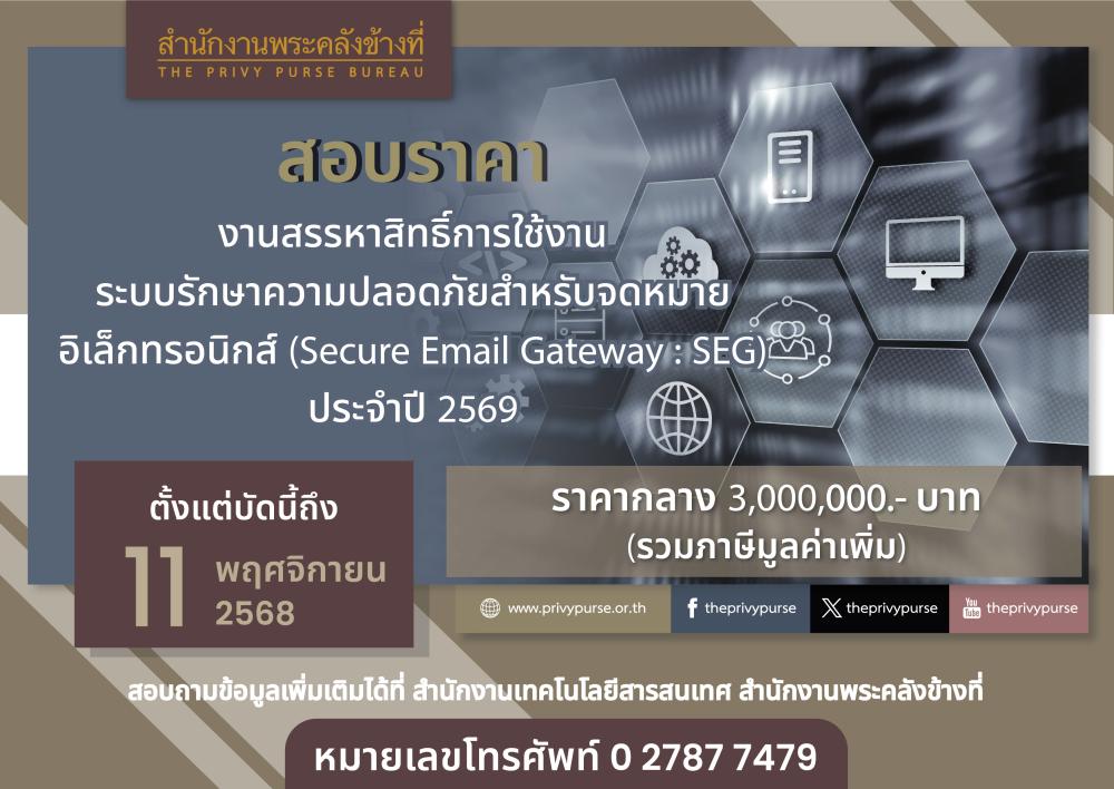 สำนักงานพระคลังข้างที่ เปิดสอบราคางานสรรหาสิทธิ์การใช้งานระบบรักษาความปลอดภัยสำหรับจดหมายอิเล็กทรอนิกส์ (Secure Email Gateway : SEG) ประจำปี 2569