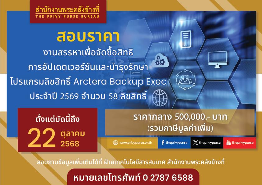 สำนักงานพระคลังข้างที่ เปิดสอบราคางานสรรหาเพื่อจัดซื้อสิทธิการอัปเดตเวอร์ชันและบำรุงรักษาโปรแกรมลิขสิทธิ์ Arctera Backup Exec ประจำปี 2569 จำนวน 58 ลิขสิทธิ์