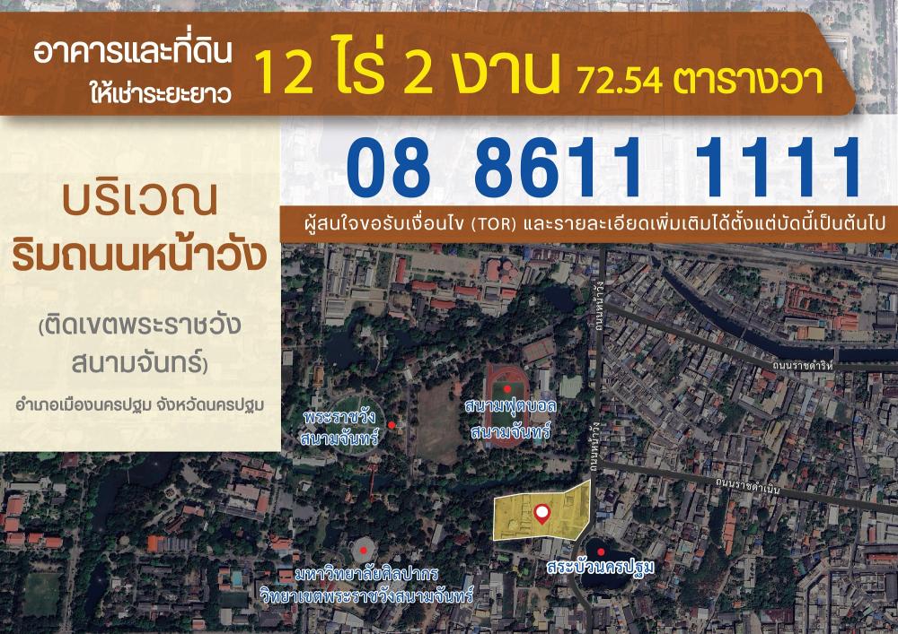 สำนักงานพระคลังข้างที่ เปิดให้เช่าอาคารและที่ดินระยะยาว จำนวน 1 แปลง ขนาดพื้นที่ 12 ไร่ 2 งาน 72.54 ตารางวา บริเวณริมถนนหน้าวัง (ติดเขตพระราชวังสนามจันทร์) อำเภอเมืองนครปฐม จังหวัดนครปฐม