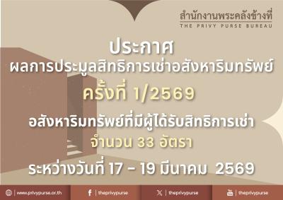 ประกาศสำนักงานพระคลังข้างที่เรื่อง ผลการประมูลสิทธิการเช่าอสังหาริมทรัพย์ ครั้งที่ 1/2569 จำนวน 39 อัตรากรุงเทพมหานคร และภูมิภาค      ตามที่ สำนักงานพระคลังข้างที่ได้เปิดประมูลสิทธิการเช่าอสังหาริมทรัพย์ ครั้งที่ 1/2569 จำนวน 39 อัตรา กรุงเทพมหานคร และภูมิภาค โดยจัดให้มีการประมูลระหว่างวันที่ 17 - 19 มีนาคม 2569 ณ สำนักงานพระคลังข้างที่ นั้น     …