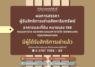 ผลการสรรหาผู้รับสิทธิการเช่าอสังหาริมทรัพย์ อาคารและที่ดิน หมายเลข 198 ถนนมหาราช แขวงพระบรมมหาราชวัง เขตพระนคร กรุงเทพมหานคร