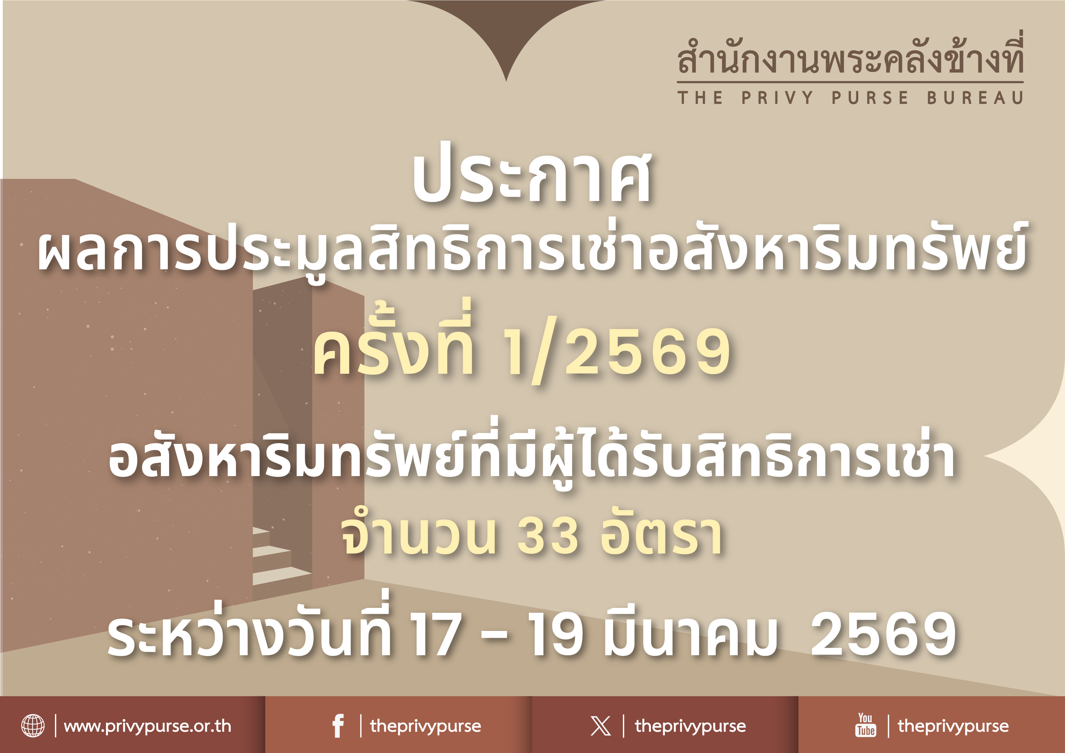 ตามที่ สำนักงานพระคลังข้างที่ได้เปิดประมูลสิทธิการเช่าอสังหาริมทรัพย์ ครั้งที่ 1/2569 จำนวน 39 อัตรา กรุงเทพมหานคร และภูมิภาค โดยจัดให้มีการประมูลระหว่างวันที่ 17 - 19 มีนาคม 2569 ณ สำนักงานพระคลังข้างที่ นั้น