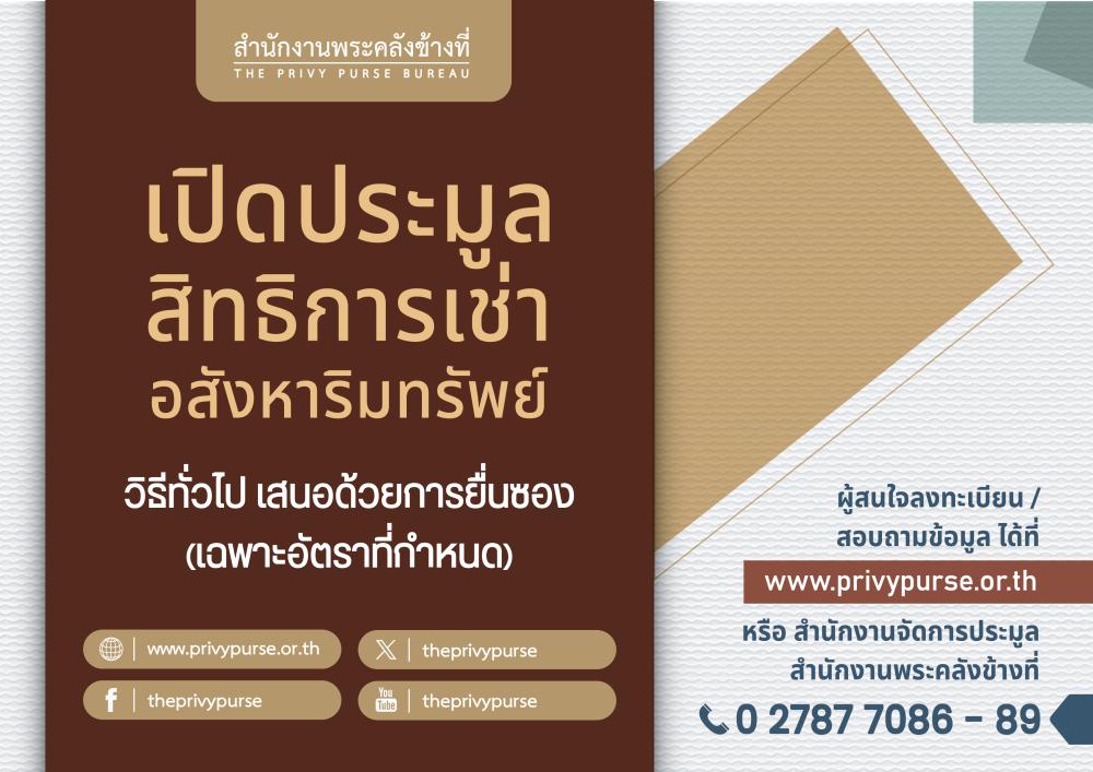สำนักงานพระคลังข้างที่ จะดำเนินการเปิดประมูลสิทธิการเช่าอสังหาริมทรัพย์ วิธีทั่วไป เสนอด้วยการยื่นซอง (เฉพาะอัตราที่กำหนด)