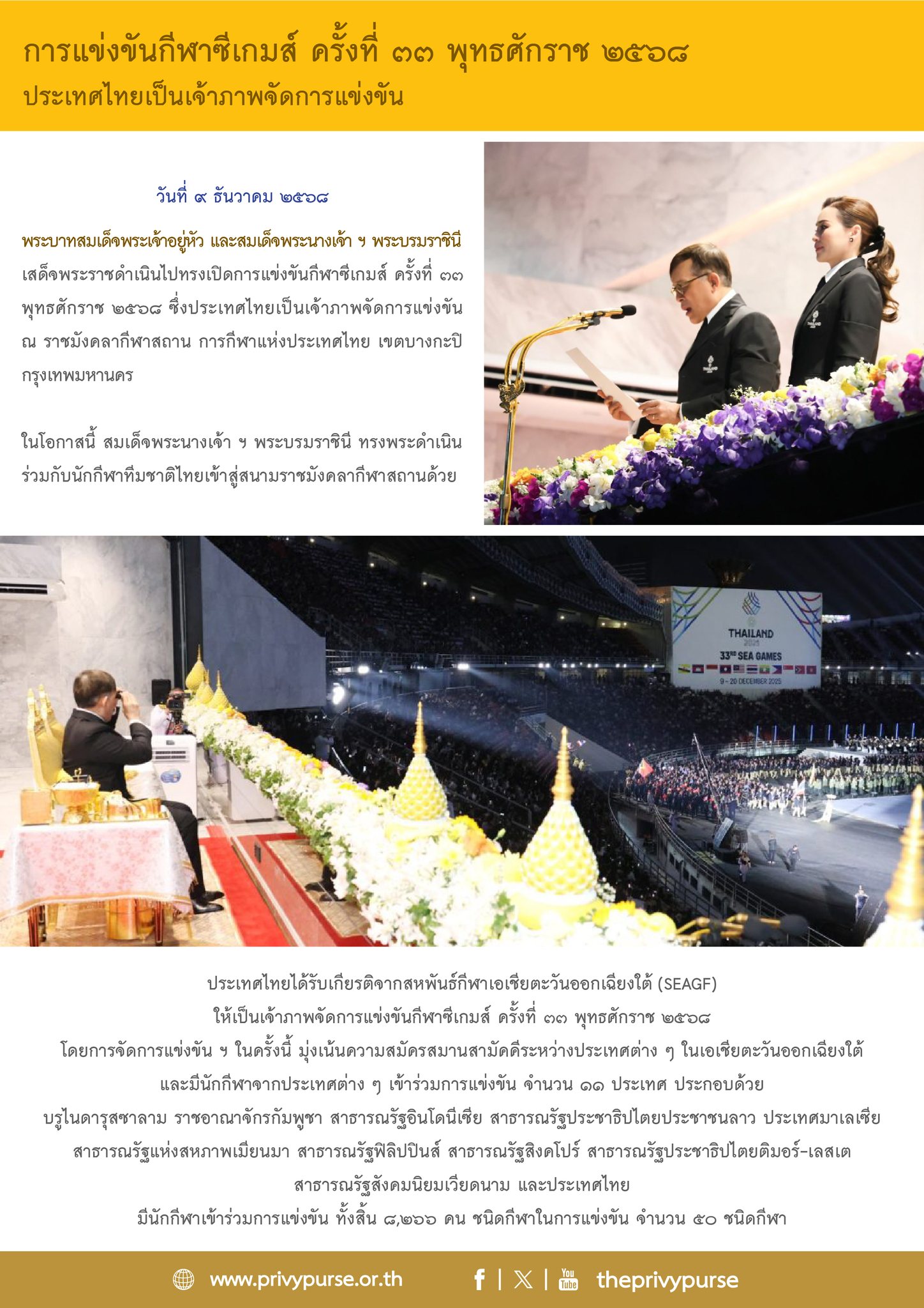 ประเทศไทยได้รับเกียรติจากสหพันธ์กีฬาเอเชียตะวันออกเฉียงใต้ (SEAGF) ให้เป็นเจ้าภาพจัดการแข่งขันกีฬาซีเกมส์ ครั้งที่ 33 พุทธศักราช 2568 โดยการจัดการแข่งขัน ฯ ในครั้งนี้ มุ่งเน้นความสมัครสมานสามัคคีระหว่างประเทศต่าง ๆ ในเอเชียตะวันออกเฉียงใต้ และมีนักกีฬาจากประเทศต่าง ๆ เข้าร่วมการแข่งขัน จำนวน 11 ประเทศ ประกอบด้วย บรูไนดารุสซาลาม ราชอาณาจักรกัมพูชา สาธารณรัฐอินโดนีเซีย สาธารณรัฐประชาธิปไตยประชาชนลาว ประเทศมาเลเซีย สาธารณรัฐแห่งสหภาพเมียนมา สาธารณรัฐฟิลิปปินส์ สาธารณรัฐสิงคโปร์ สาธารณรัฐประชาธิปไตยติมอร์-เลสเต สาธารณรัฐสังคมนิยมเวียดนาม และประเทศไทย มีนักกีฬาเข้าร่วมการแข่งขันทั้งสิ้น 8,266 คน ชนิดกีฬาในการแข่งขัน จำนวน 50 ชนิดกีฬา การแข่งขันกีฬาซีเกมส์นี้ จัดขึ้นระหว่างวันที่ 9 – 20 ธันวาคม 2568 ณ กรุงเทพมหานคร และจังหวัดชลบุรี ซึ่งเป็นจังหวัดที่มีความพร้อมและศักยภาพในการดำเนินการที่มุ่งเน้นให้เป็นศูนย์กลางการกีฬา การท่องเที่ยว การศึกษา นวัตกรรม และบริการในระดับมาตรฐานนานาชาติ