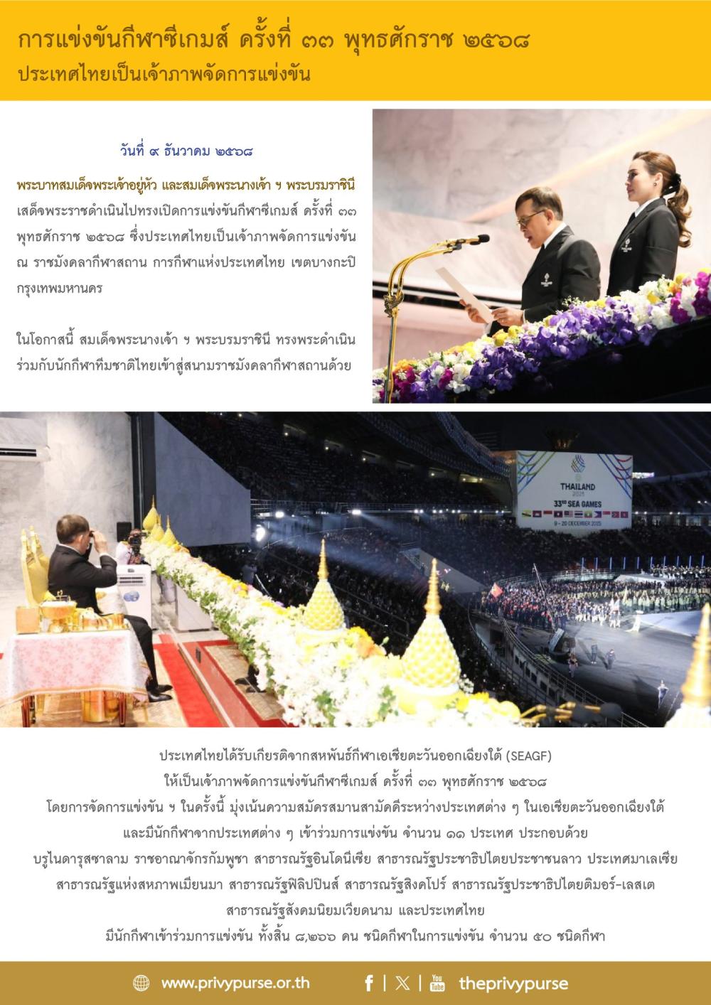 วันที่ 9 ธันวาคม 2568 พระบาทสมเด็จพระเจ้าอยู่หัว และสมเด็จพระนางเจ้า ฯ พระบรมราชินี เสด็จพระราชดำเนินโดยรถยนต์พระที่นั่ง จากพระที่นั่งอัมพรสถาน พระราชวังดุสิต ไปทรงเปิดการแข่งขันกีฬาซีเกมส์ ครั้งที่ 33 พุทธศักราช 2568 ซึ่งประเทศไทยเป็นเจ้าภาพจัดการแข่งขัน ณ ราชมังคลากีฬาสถาน การกีฬาแห่งประเทศไทย เขตบางกะปิ กรุงเทพมหานคร
