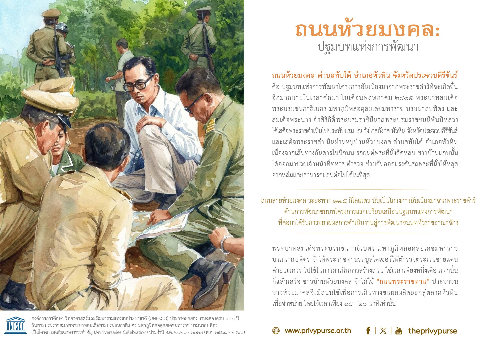 ถนนสายห้วยมงคล ระยะทาง 11.5 กิโลเมตร นับเป็นโครงการอันเนื่องมาจากพระราชดำริด้านการพัฒนาชนบทโครงการแรก เปรียบเสมือนปฐมบทแห่งการพัฒนา ที่ต่อมาได้รับการขยายผลการดำเนินงานสู่การพัฒนาชนบททั่วราชอาณาจักร