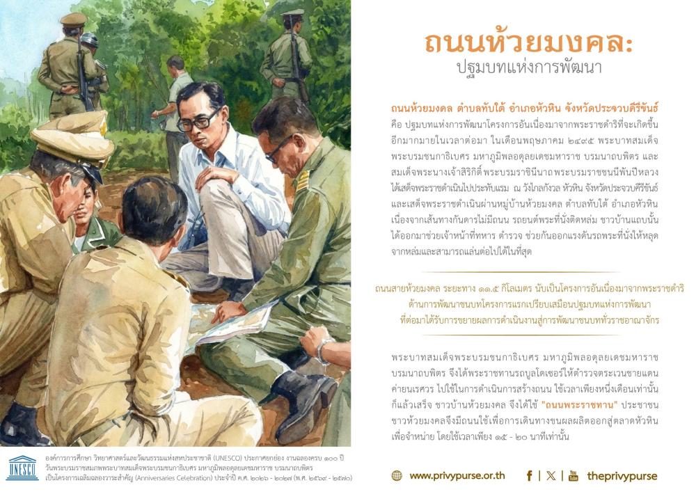 ถนนห้วยมงคลปฐมบทแห่งการพัฒนานี้ จึงเหมือนกับต้นน้ำลำธารแห่งพระมหากรุณาธิคุณที่จะไหลเอิบอาบไม่ขาดสายไปในทุกพื้นที่ที่มีราษฎรหรือพสกนิกรของพระองค์อยู่