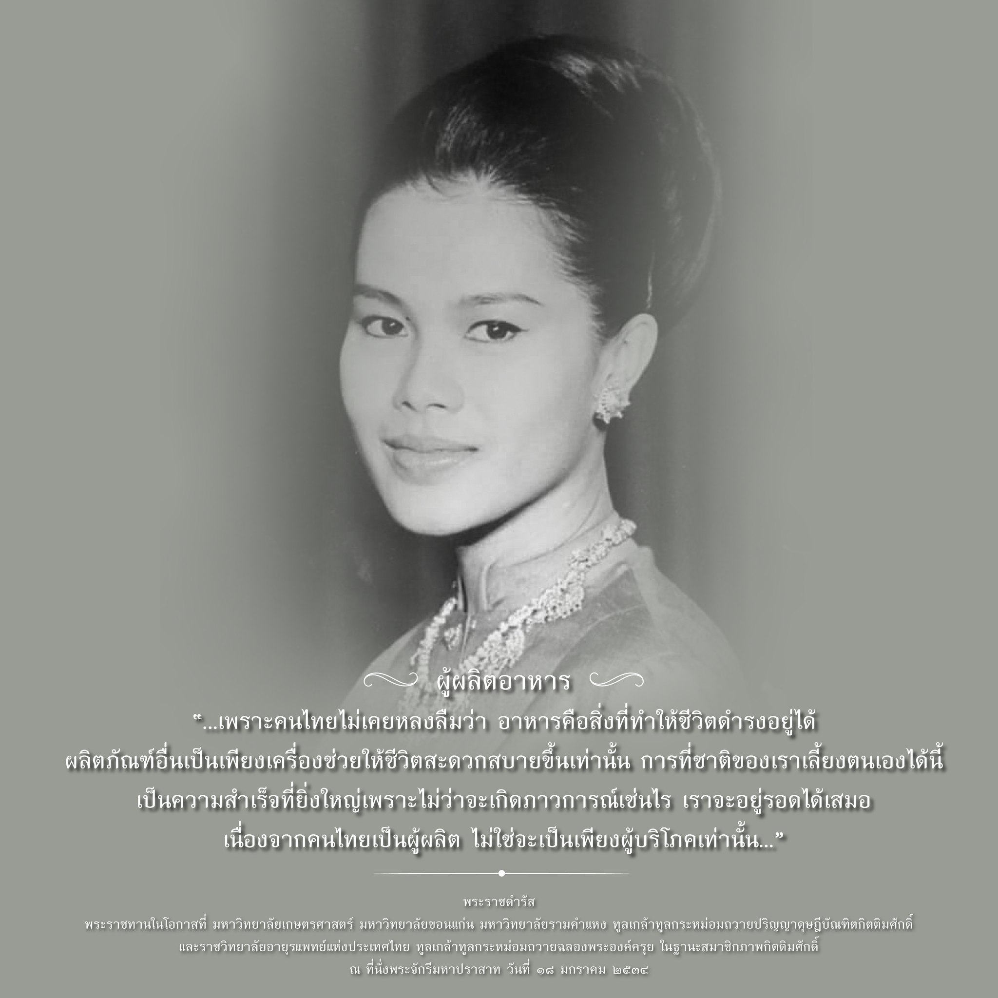“...เพราะคนไทยไม่เคยหลงลืมว่า อาหารคือสิ่งที่ทำให้ชีวิตดำรงอยู่ได้ ผลิตภัณฑ์อื่นเป็นเพียงเครื่องช่วยให้ชีวิตสะดวกสบายขึ้นเท่านั้น การที่ชาติของเราเลี้ยงตนเองได้นี้เป็นความสำเร็จที่ยิ่งใหญ่เพราะไม่ว่าจะเกิดภาวการณ์เช่นไร เราจะอยู่รอดได้เสมอ เนื่องจากคนไทยเป็นผู้ผลิต ไม่ใช่จะเป็นเพียงผู้บริโภคเท่านั้น...”