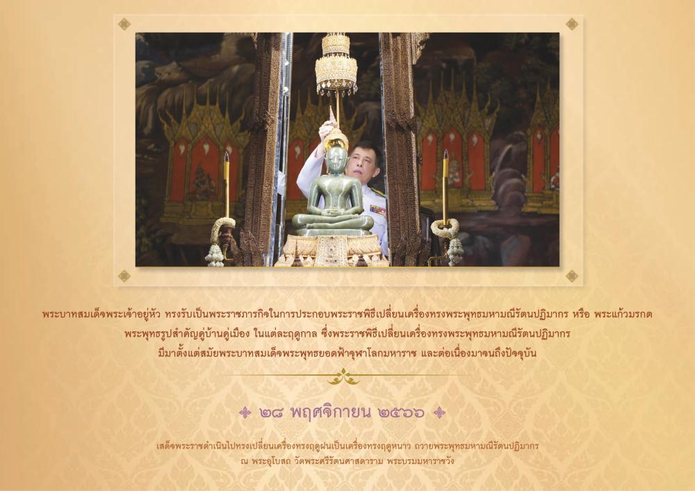 พระบาทสมเด็จพระเจ้าอยู่หัว เสด็จพระราชดำเนินไปทรงเปลี่ยนเครื่องทรงฤดูฝนเป็นเครื่องทรงฤดูหนาว ถวายพระพุทธมหามณีรัตนปฏิมากร ณ พระอุโบสถ วัดพระศรีรัตนศาสดาราม พระบรมมหาราชวัง ด้วยทรงรับเป็นพระราชภารกิจในการประกอบพระราชพิธีเปลี่ยนเครื่องทรงพระพุทธมหามณีรัตนปฏิมากร หรือ พระแก้วมรกต พระพุทธรูปสำคัญคู่บ้านคู่เมือง ในแต่ละฤดูกาล ซึ่งพระราชพิธีเปลี่ยนเครื่องทรงพระพุทธมหามณีรัตนปฏิมากร มีมาตั้งแต่สมัยพระบาทสมเด็จพระพุทธยอดฟ้าจุฬาโลกมหาราช และต่อเนื่องมาจนถึงปัจจุบัน