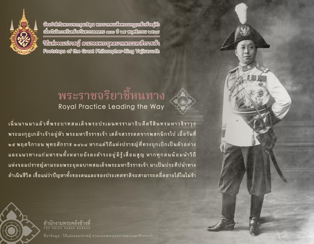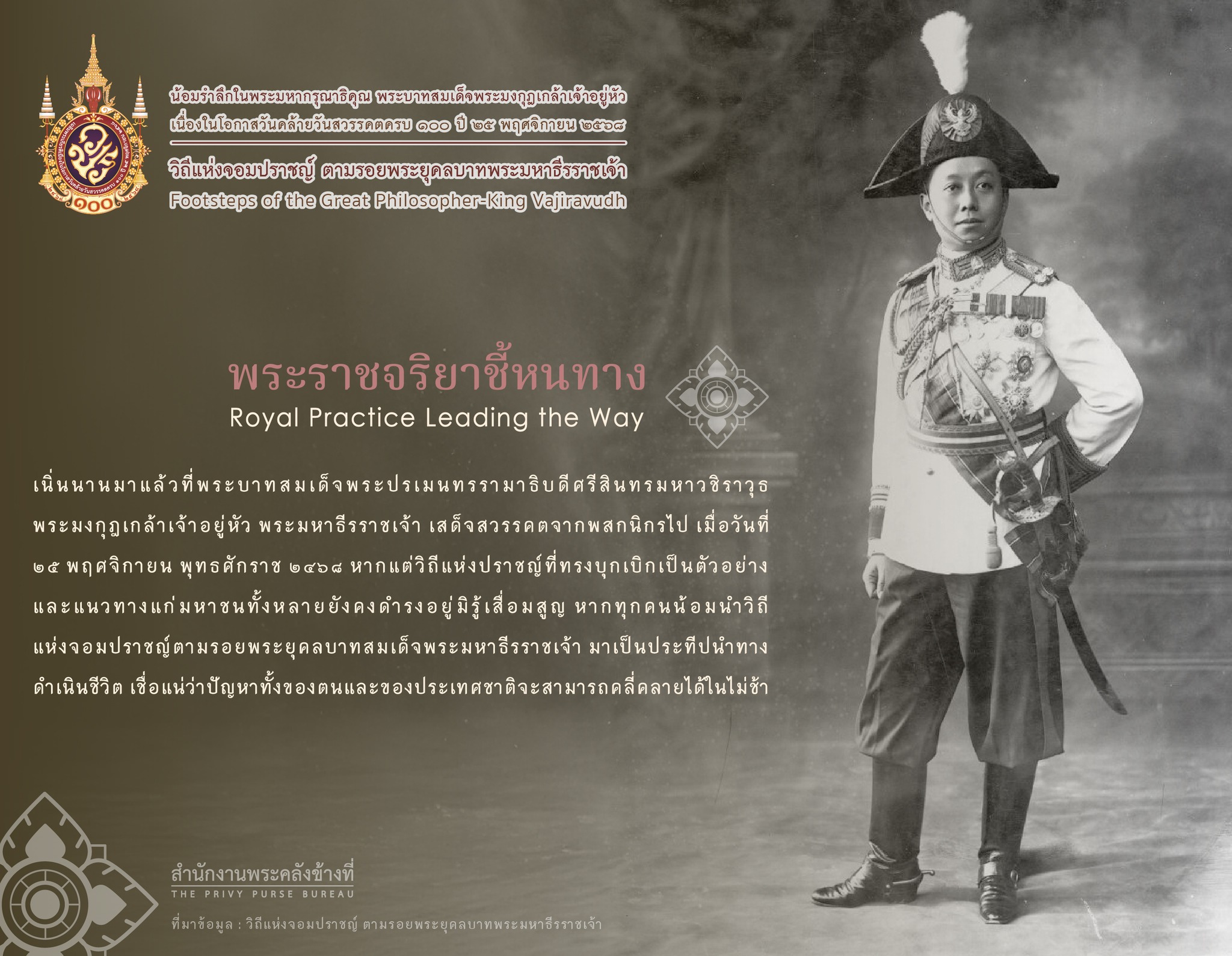 เนิ่นนานมาแล้วที่พระบาทสมเด็จพระปรเมนทรรามาธิบดีศรีสินทรมหาวชิราวุธ พระมงกุฎเกล้าเจ้าอยู่หัว พระมหาธีรราชเจ้า เสด็จสวรรคตจากพสกนิกรไป เมื่อวันที่ ๒25 พฤศจิกายน พุทธศักราช 2468 หากแต่วิถีแห่งปราชญ์ที่ทรงบุกเบิกเป็นตัวอย่างและแนวทางแก่มหาชนทั้งหลายยังคงดำรงอยู่มิรู้เสื่อมสูญ หากทุกคนน้อมนำวิถีแห่งจอมปราชญ์ตามรอยพระยุคลบาทสมเด็จพระมหาธีรราชเจ้า มาเป็นประทีปนำทางดำเนินชีวิต เชื่อแน่ว่าปัญหาทั้งของตนและของประเทศชาติจะสามารถคลี่คลายได้ในไม่ช้า