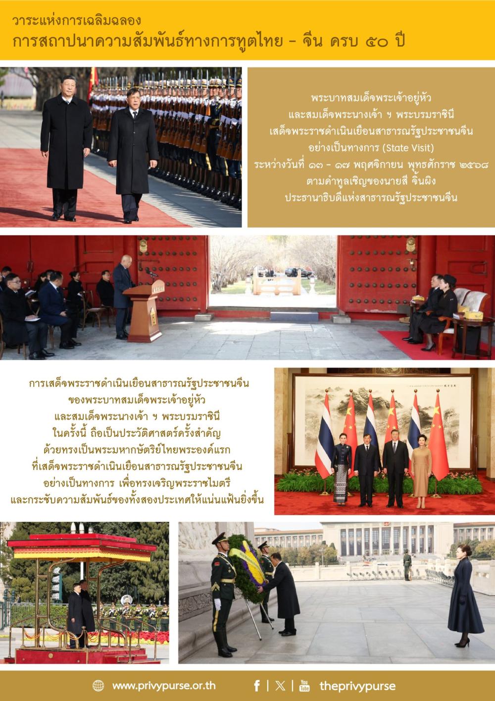 พระบาทสมเด็จพระเจ้าอยู่หัว และสมเด็จพระนางเจ้า ฯ พระบรมราชินี เสด็จพระราชดำเนินเยือนสาธารณรัฐประชาชนจีนอย่างเป็นทางการ (State Visit) ระหว่างวันที่ 13 – 17 พฤศจิกายน พุทธศักราช 2568 ตามคำทูลเชิญของนายสี จิ้นผิง ประธานาธิบดีแห่งสาธารณรัฐประชาชนจีน