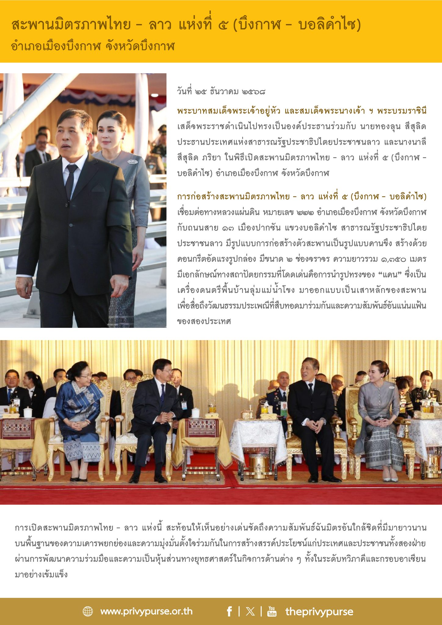 วันที่ 25 ธันวาคม 2568 พระบาทสมเด็จพระเจ้าอยู่หัว และสมเด็จพระนางเจ้า ฯ พระบรมราชินี เสด็จพระราชดำเนินโดยรถยนต์พระที่นั่ง จากพระที่นั่งอัมพรสถาน พระราชวังดุสิต ไปยังท่าอากาศยานทหาร ดอนเมือง เพื่อประทับเครื่องบินพระที่นั่ง เสด็จพระราชดำเนินไปทรงเป็นองค์ประธานร่วมกับ นายทองลุน สีสุลิด ประธานประเทศแห่งสาธารณรัฐประชาธิปไตยประชาชนลาว และนางนาลี สีสุลิด ภริยา ในพิธีเปิดสะพานมิตรภาพไทย – ลาว แห่งที่ 5 (บึงกาฬ – บอลิคำไซ) อำเภอเมืองบึงกาฬ จังหวัดบึงกาฬ