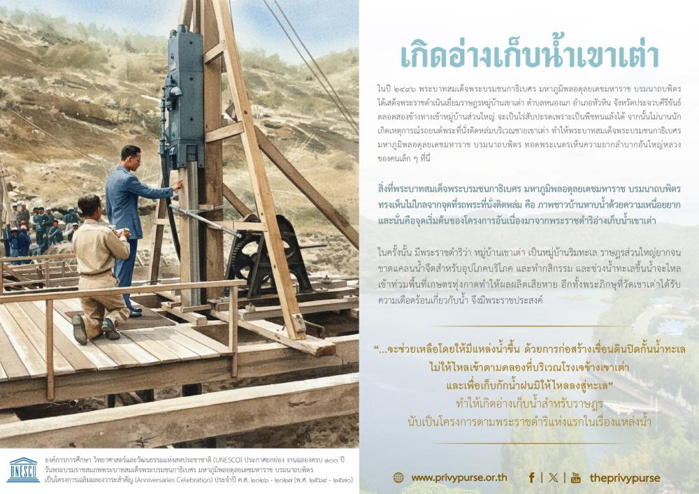 สิ่งที่พระบาทสมเด็จพระบรมชนกาธิเบศร มหาภูมิพลอดุลยเดชมหาราช บรมนาถบพิตร ทรงเห็นไม่ไกลจากจุดที่รถพระที่นั่งติดหล่ม คือ ภาพชาวบ้านหาบน้ำด้วยความเหนื่อยยาก และนั่นคือจุดเริ่มต้นของโครงการอันเนื่องมาจากพระราชดำริอ่างเก็บน้ำเขาเต่า